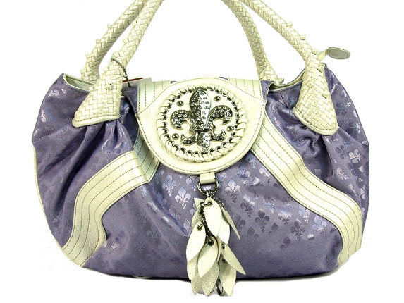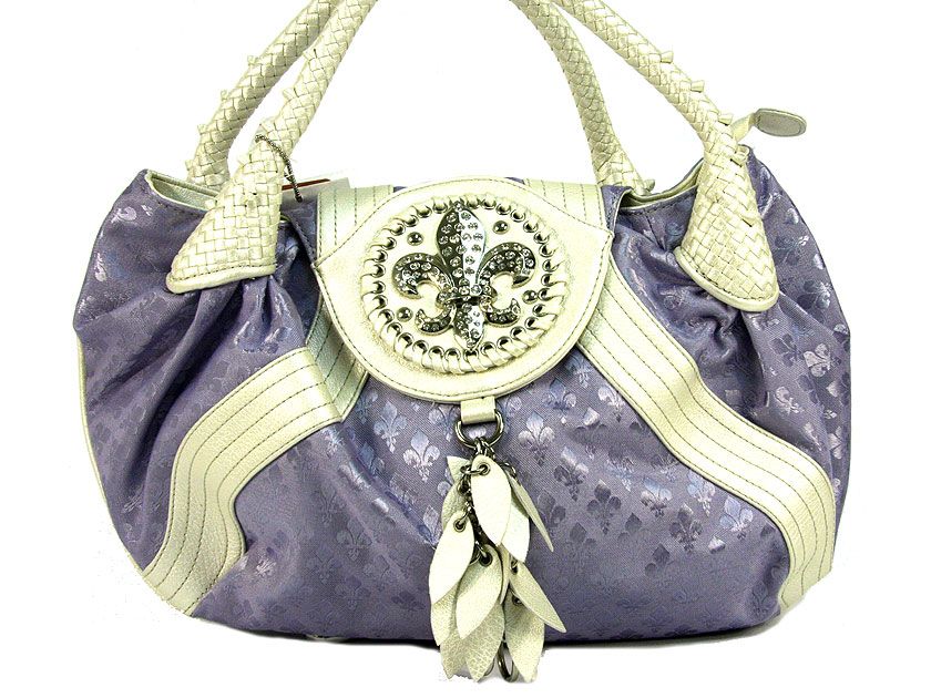 Fleur De Liz Licensed Jacquard Handbag with braided double handle & logo in rhinestones on the flap over the bag.