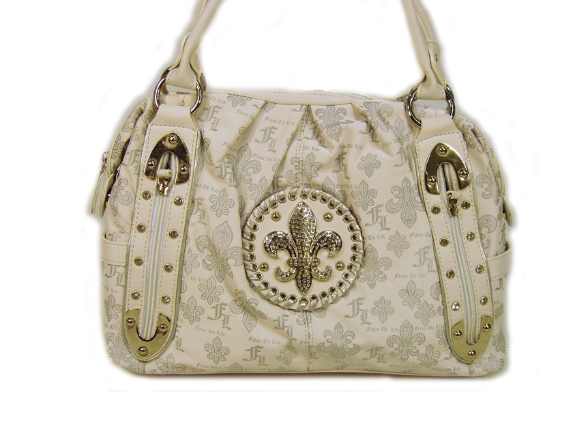 Fleur De Liz Licensed PVC Handbag with logo print all over it. Double shoulder handle, top zipper closure & twop open side pockets. Logo in the front with rhinestones & also two stylish zipper accents. Imported.