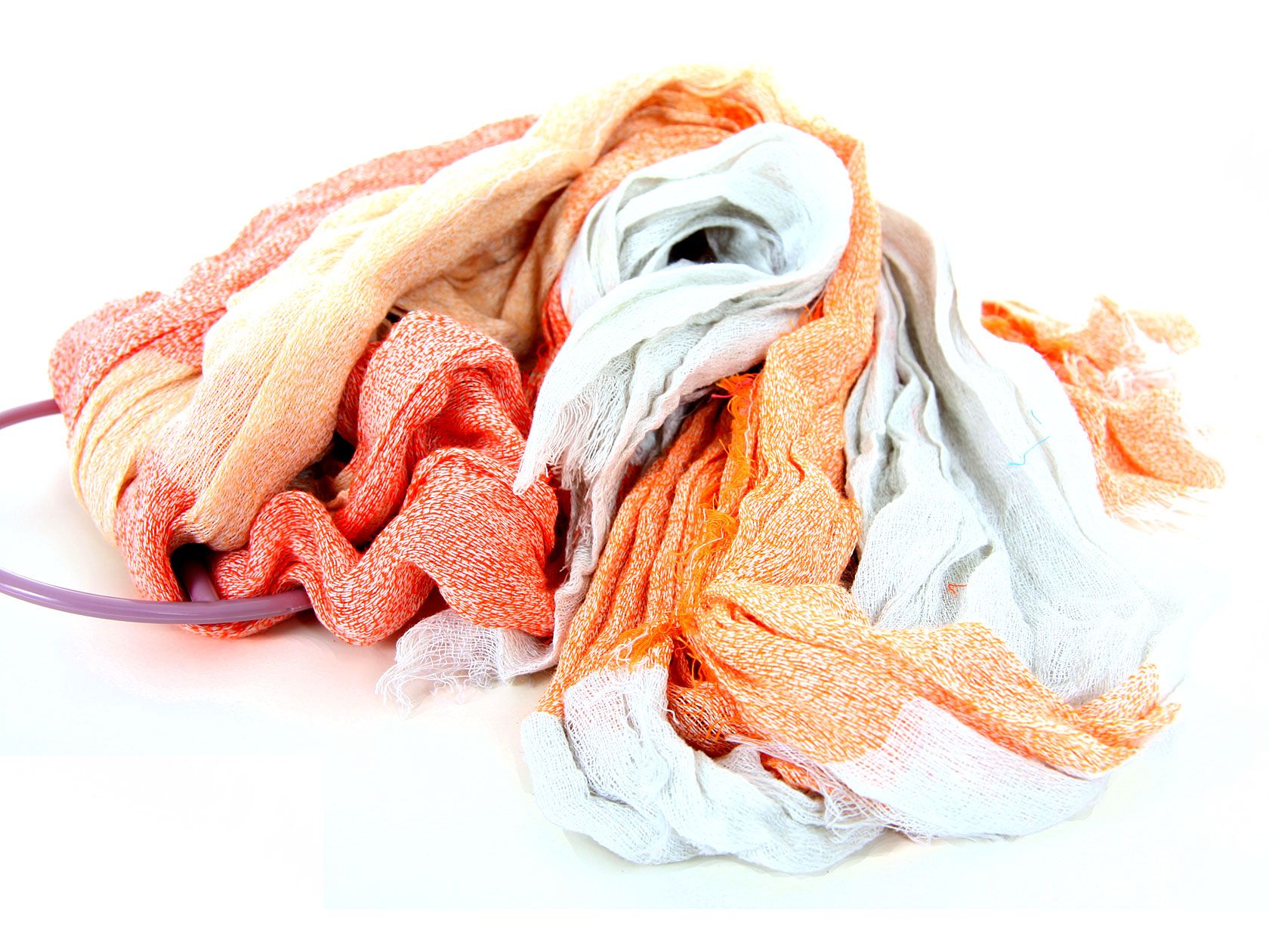 Crinkled Two Tone Woven Polyester Scarf with eyelash fringes all around it. Soft and lightweight to use & comes on a small round hanger. Imported. 100% polyester.