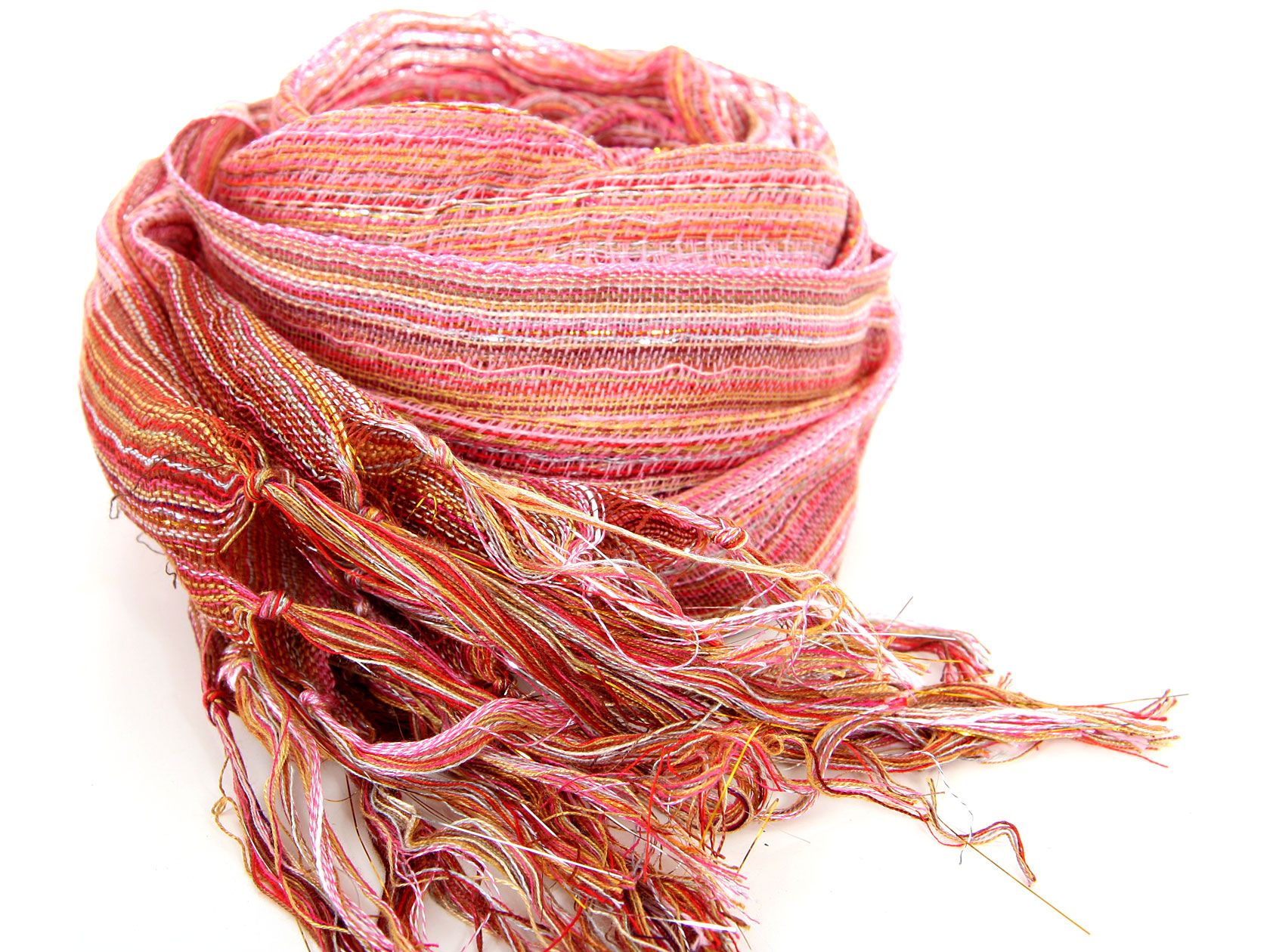 Lightweight sheer polyester scarf with shining woven multi colored stripes and long knotted fringes on its edges. Contrasting borders of the scarf give an edge to this scarf which can be used all year around. Imported.