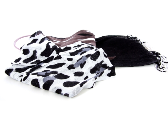 Black & White Cow Print 100% viscose scarf with grey colored flames print on its ends. Twisted fringes on the ends. Lightweight and very soft to use. Imported.