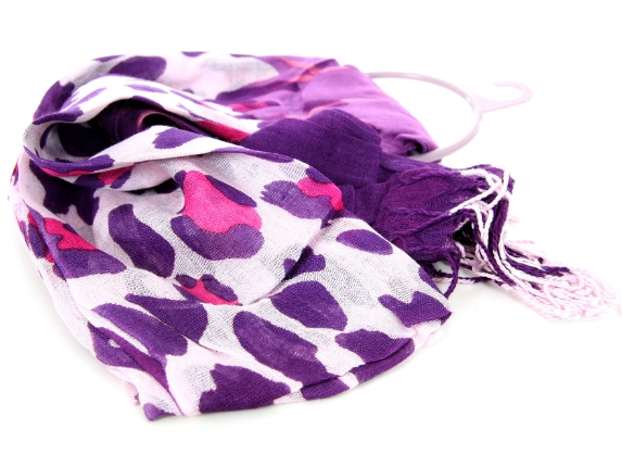 White & Purple Cow Print 100% Viscose Scarf with Pirple & Pink Colored Ends. Twisted fringes on the ends. Lightweight and very soft to use. Imported.