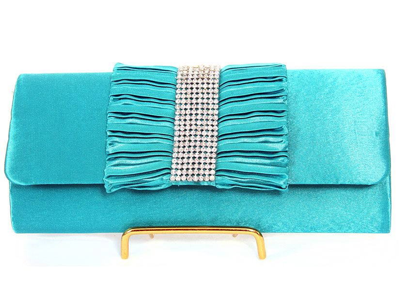 Satin Evening Bag with same fabric ruffled design and also rhinestones strap over it.