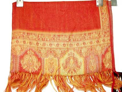 100% Pure Wool Jamawar Shawl in Red color with artistic pattern in gold color on the border. Threads like fringes on the ends of the shawl. Imported.