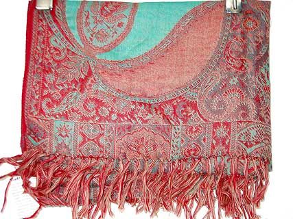 Artistically patterned 100% pure wool Jamawar shawl in shades of red & aqua green. Imported.