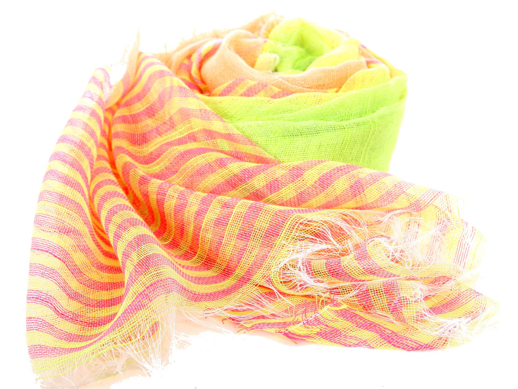 Yellow & pink horizontal stripes pattern flourish over this bright orange 100% polyester scarf. The sheer scarf has eyelash fringes all over it. Imported. Hand wash.