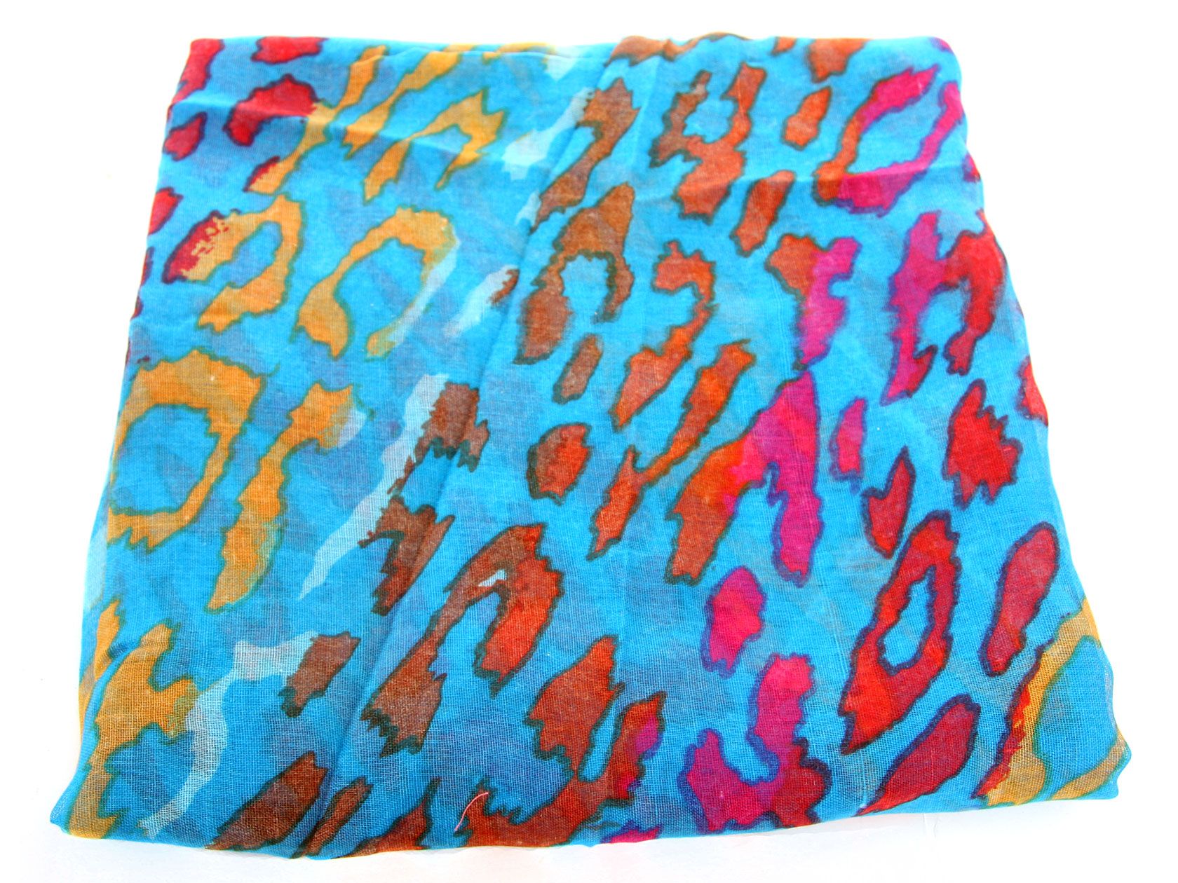 Semi-sheer turquoise blue polyester scarf with multi colored abstract print. Big size of the scarf makes it possible to be used as a shawl, wrap or scarf around the neck. Imported. Hand wash.
