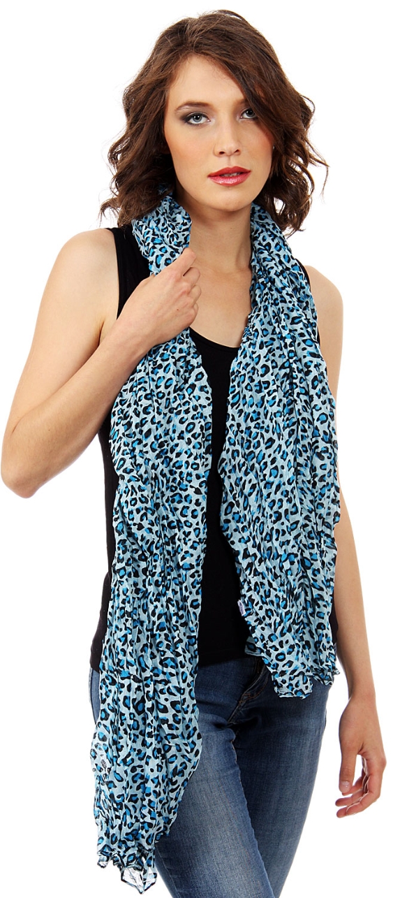 Leopard spots pattern this breezy crinkled scarf for a double dose of on-trend appeal. Two tone leopard print over solid color background. Can be used in multiple ways with nay kind of outfit.