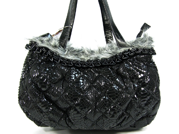 Snake print PU Fashion Handbag with faux fur trim on the top of the bag with zipper closure & double shoulder straps.