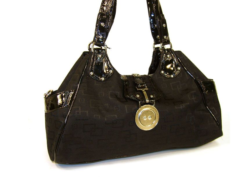Overlap square print jacquard fashion handbag with patent leather patchwork, double shoulder handle & belted clasp closure. Imported.