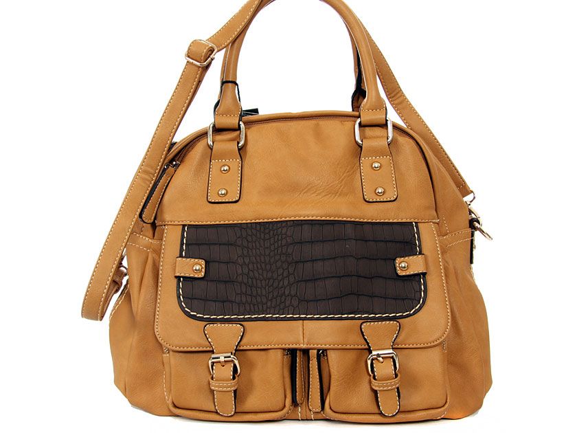 Faux leather double handle bag. Two separate section with zipper closing, inside side zipper pocket, outside back zipper pocket, adjustable shoulder strap included.
