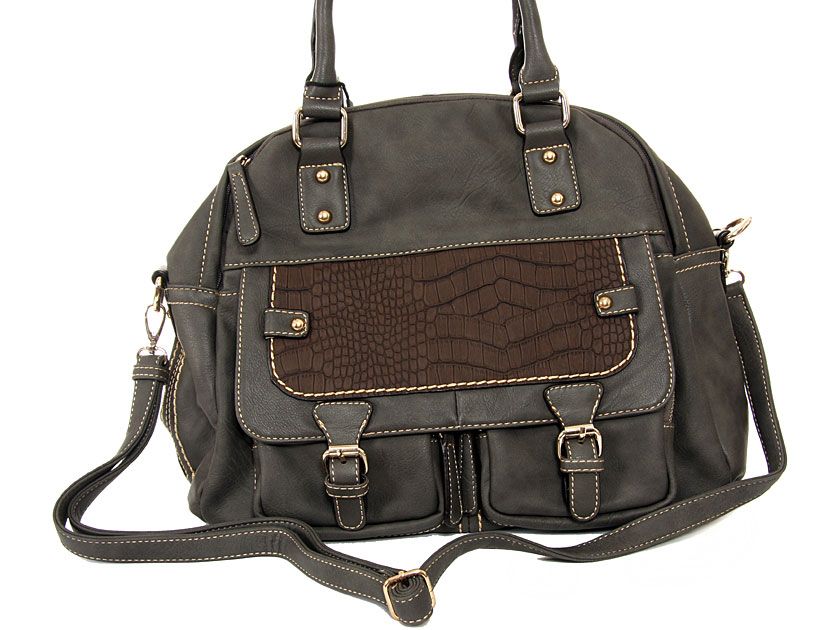 Faux leather double handle bag. Two separate sections with zipper closings, inside side zipper pocket, outside back zipper pocket, adjustable shoulder strap included