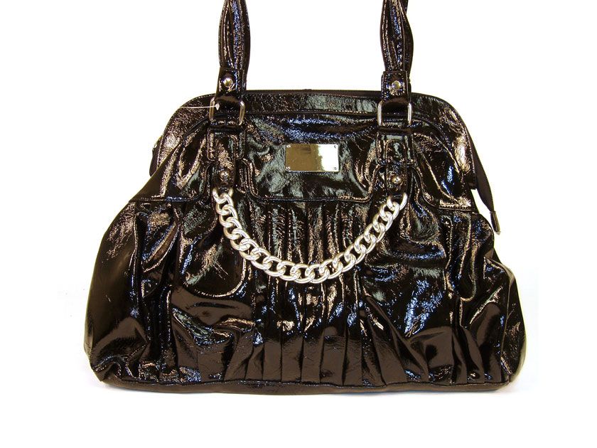 Trendy Handbag with distress pattern and metal chain detail. Bag has a double handle and a top zipper closure. Made of PU (polyurethane).