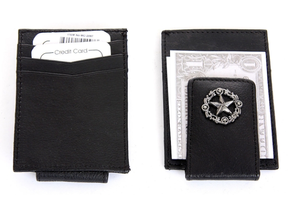 Carry your money in style. This is a Genuine Leather credit card holder and magnetic Money clip with metallic zinc concho lone star design. As this is genuine leather, please be aware that there will be some small creases and nicks in the leather but the wallet are all brand new.