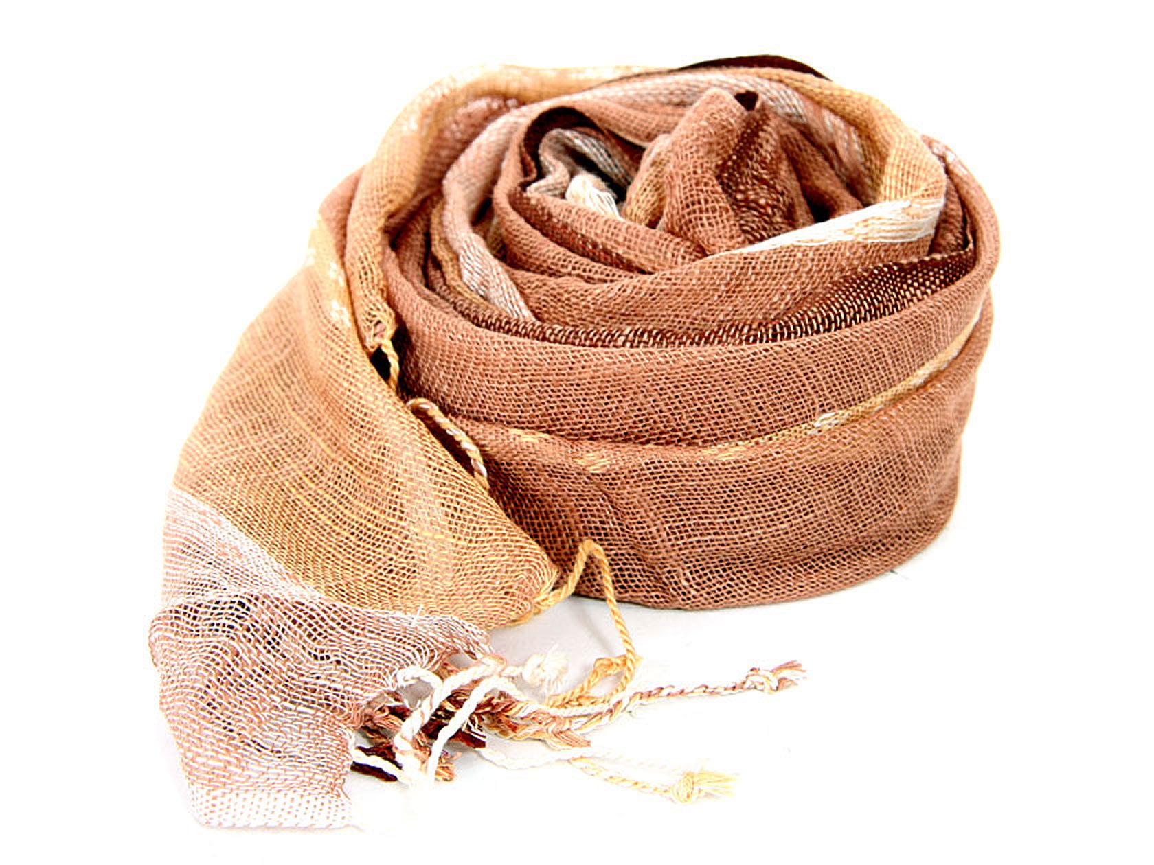 Open weave yarn dyed 100% viscose scarf in shades of gold, mustard & peach. This scarf is both lightweight & soft. Imported.