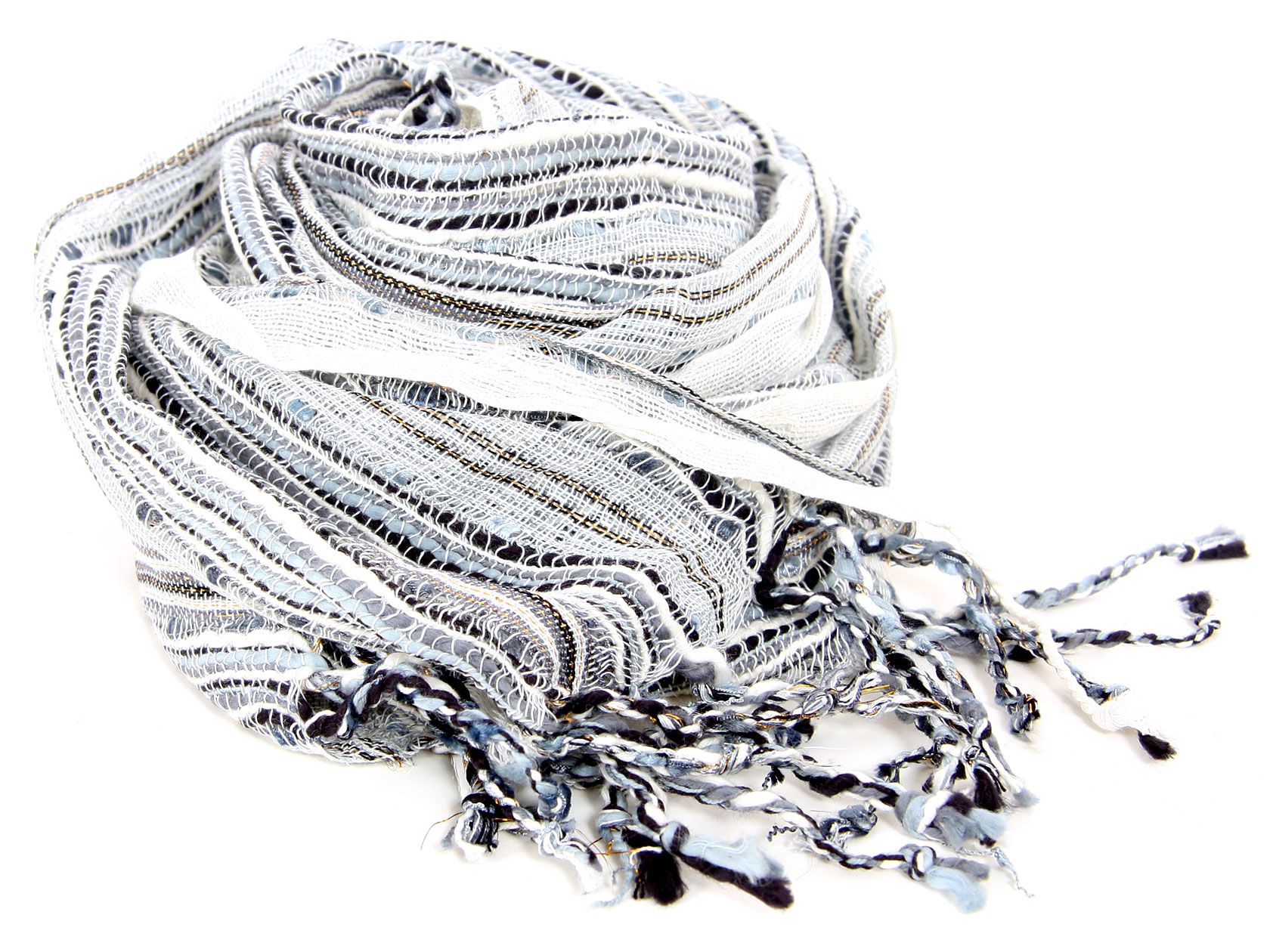 Yarn Dyed 100% viscose open weave scarf in light hues of ivory, sky blue & black colors. Twisted fringes at its ends. imported.