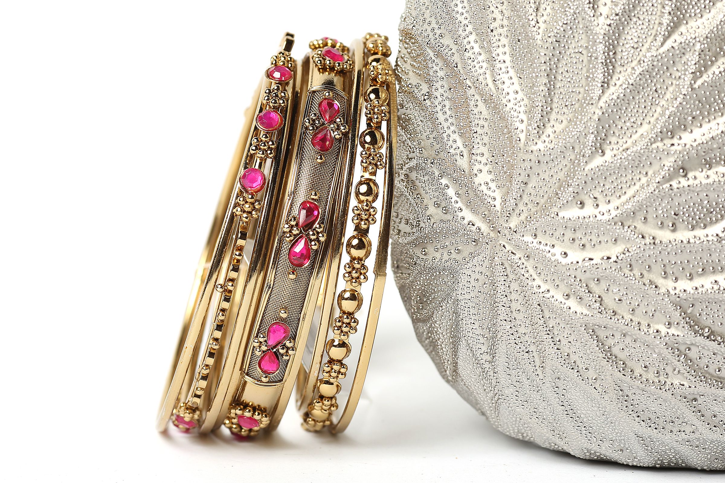 Antique gold colored 8 pieces fashion bangles set has fuchsia beads on 2 of the bangles which gives an edge to this set. 5 thin bangles with 2 bangles have metal floral pattern & one wide bangle has fuchsia stones. Hand crafted in India by expert artisans.