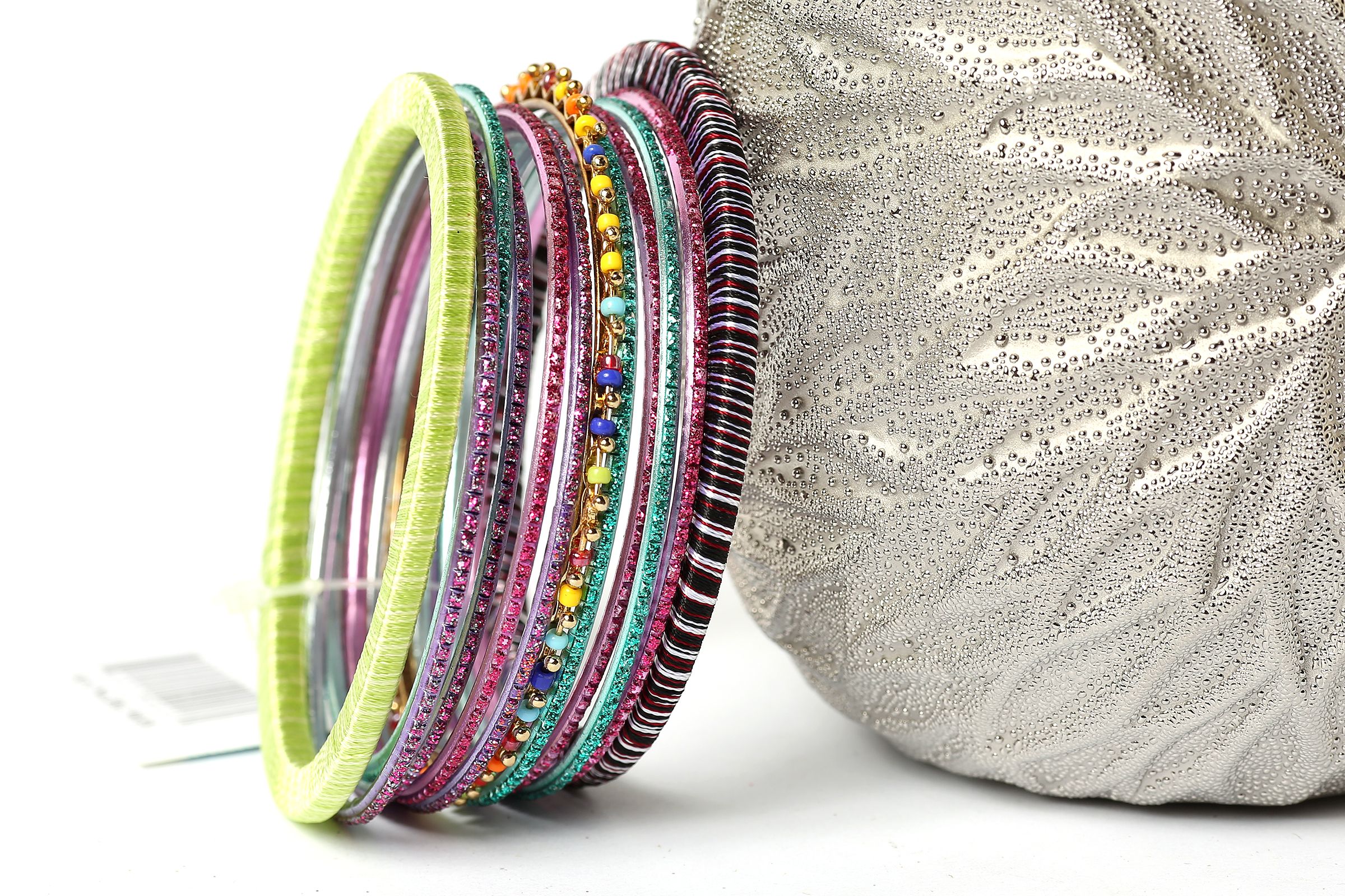 Colorful & lightweight 12 pieces bangles set can be matched with any kind of outfit. 9 thin glittery bangles, one thin beaded bangle & 2 threaded bangles - one lime green & one multi colored. Hand crafted in India.