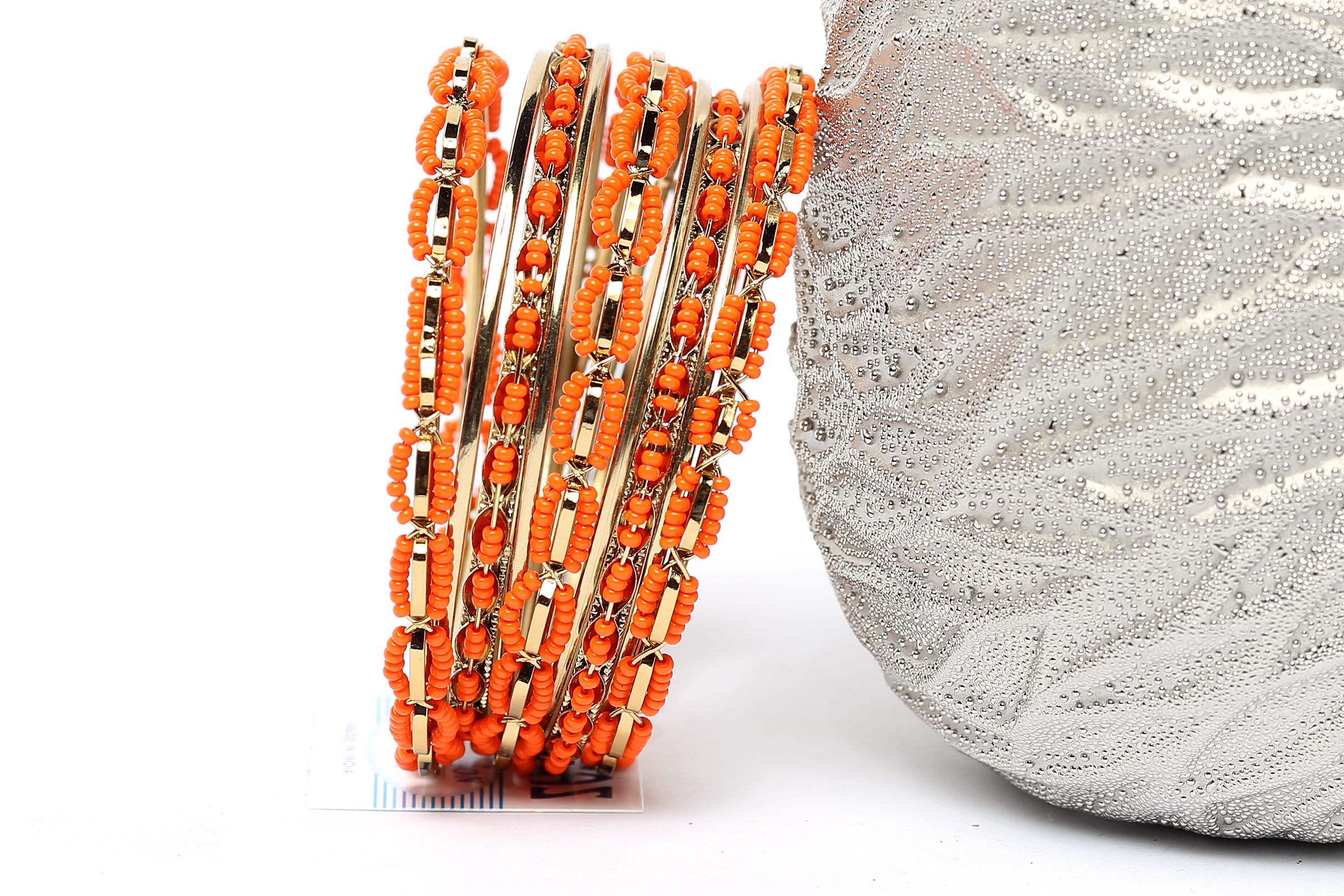 This Orange Beads Gold Metal Fashion Bangles Set can add zing to nay kind of outfit. Set includes 4 thin bangles, 2 petal patterned with beads and 3 bangles having beads in boxy shape. Durable & long lasting quality.