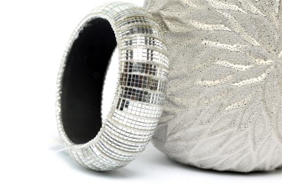 Wide cuff rounded fashion bangle in Silver color has shiny translucent mirrors all over it. Silver makes little sections on the bangle. Hand crafted by expert artisans in India. Durable and high quality construction.