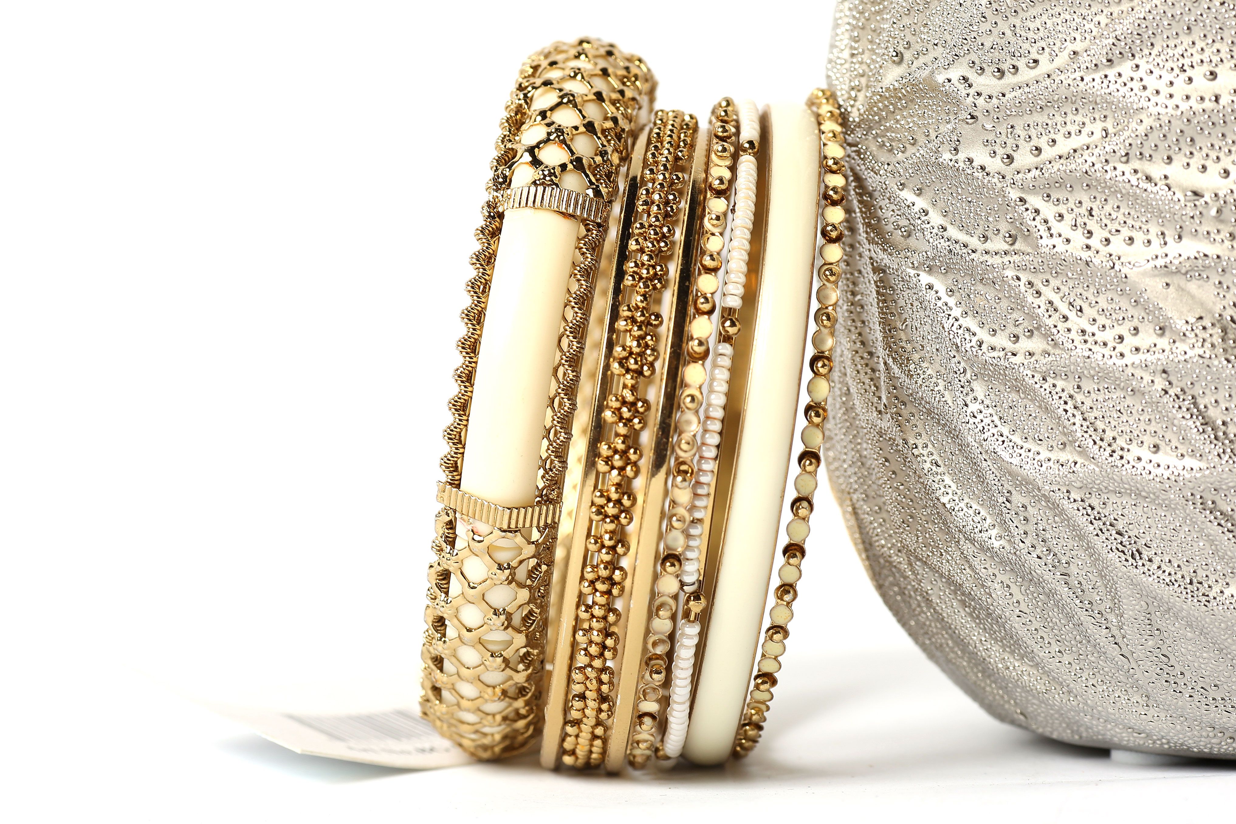 Gold Colored Metal Fashion Bangles Set consists of 8 pieces - one ivory colored wide bangle with metal mesh design, beaded thin bangles & patterned metal bangles also. Can be matched with any kind of outfit for that extra zing.