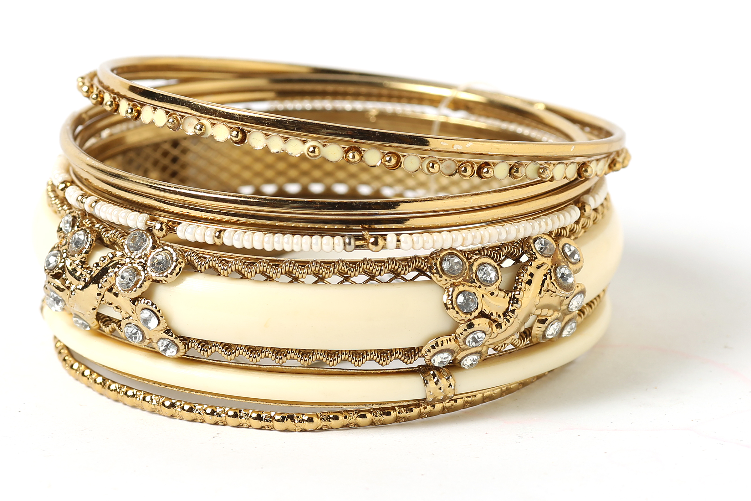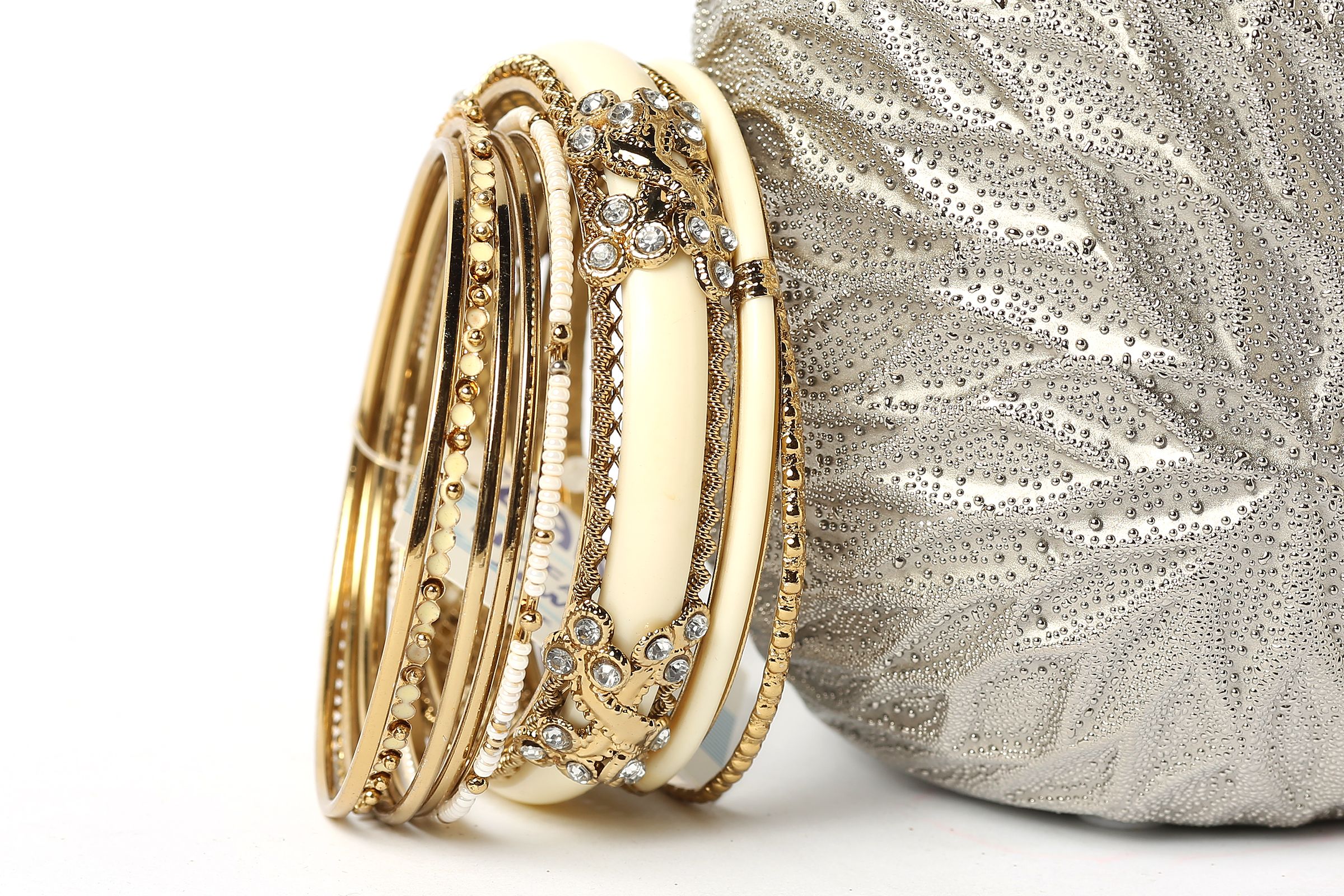 This Ivory with silver hand crafted fashion bangles set has 8 pieces - one broad resin bangle in mesh metal frame, one black resin bangle, 2 thin beaded bangles & 4 thin silver colored bangles. Matches with almost any kind of outfit & very durable.