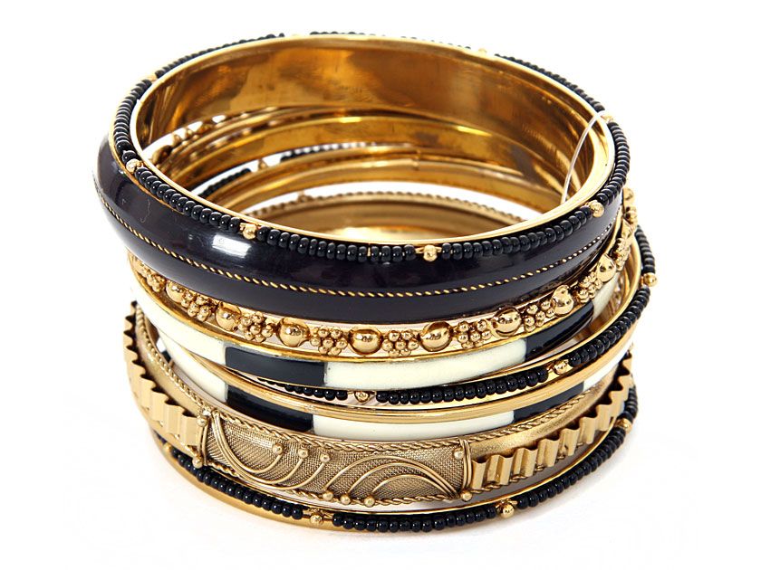 Very beautiful & trendy 11 pieces set includes one wide black bangle, one metal patterned bangle, 2 painted bangles, 3 thin gold colored bangles, 3 thin black beads bangles & 1 floral pattern bangle. Hand crafted in India.