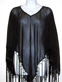 Small polka dots print 100% rayon material sheer poncho top with v-neck and long hanging fringes in a patterned way on its border. Imported.