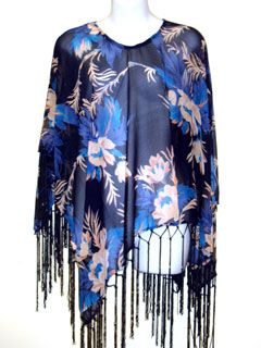 Blue Floral Print Rayon Poncho in Navy color with long hanging fringes along its border. Imported.