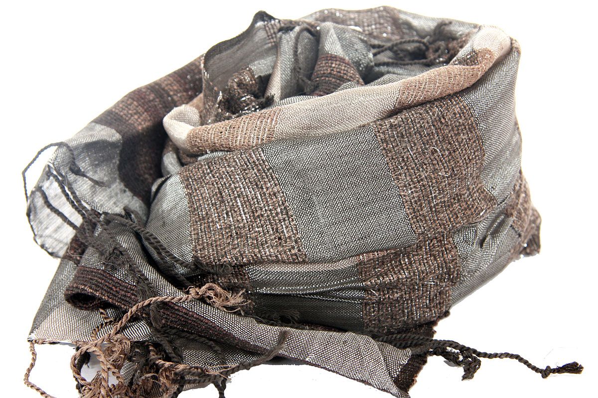 Beautiful pewter & gold metallic vertical plaids are crossed by horizontal coffee & silver colored plaids. Broad coffee colored border along the width of scarf & also long twisted fringes completes this 100% viscose scarf.