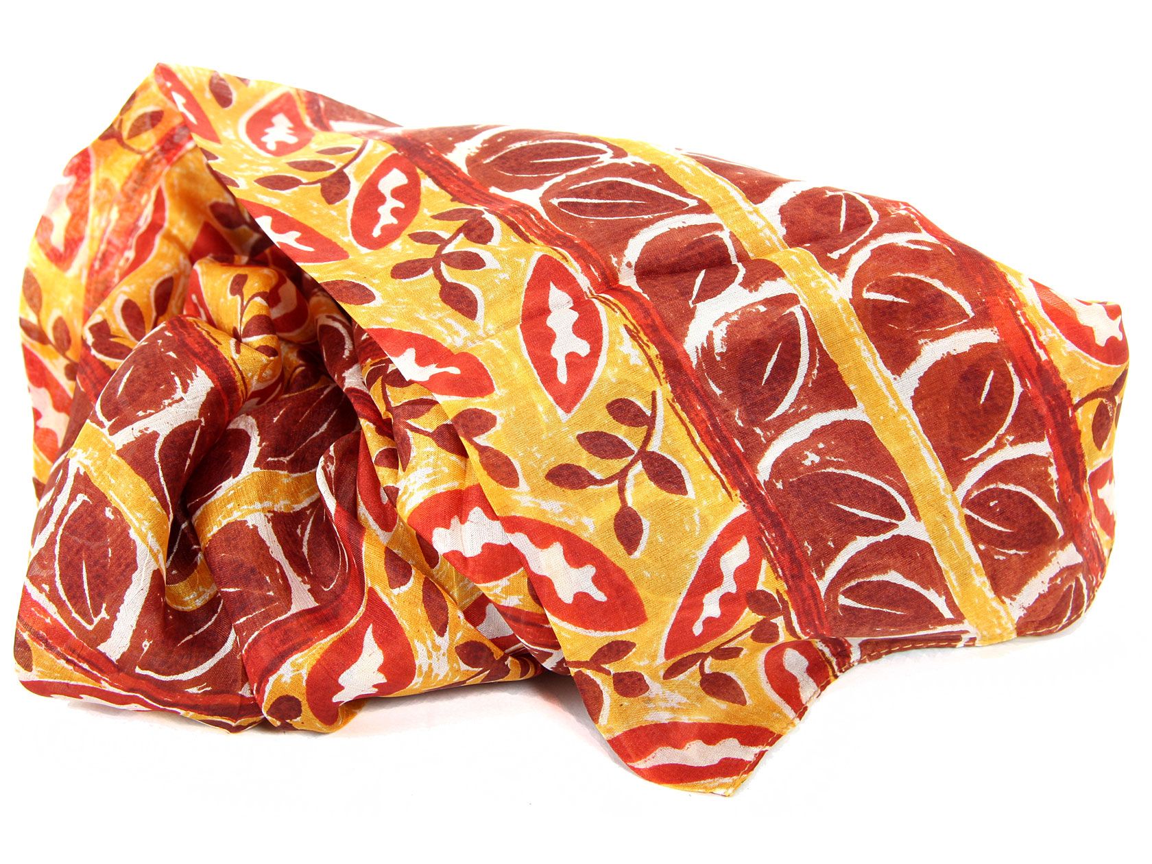 Leafy print in red & brown on this yellow colored 100% silk scarf. Bright colored scarf can enliven any kind of outfit & can be used in any possible way. Made in India.