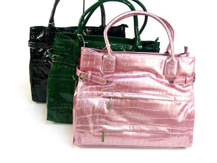 Croco Embossed shining patent leather spacious handbag with double handle, top zipper closure & belt like embellishments on the sides of the bag. Multiple zipper pockets in the front. Made of PU (polyurethane).