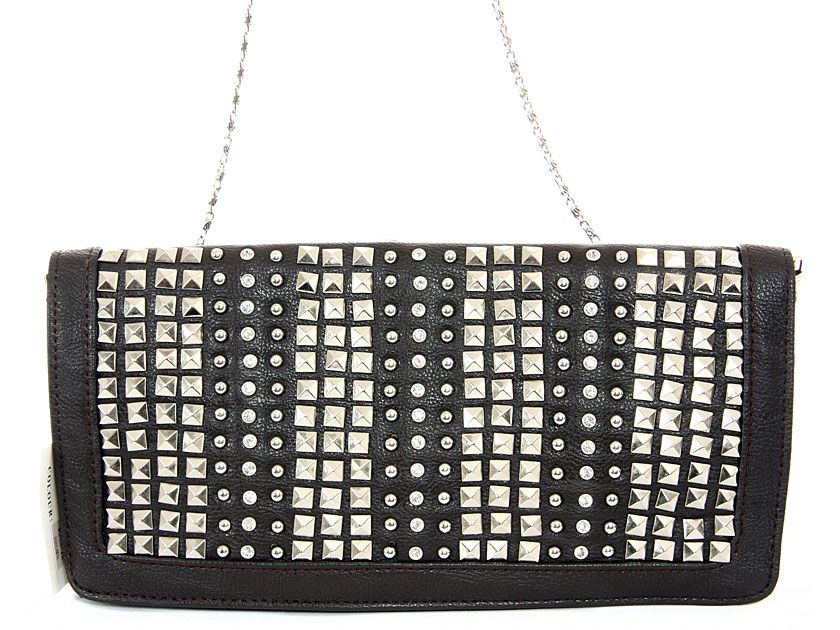 Faux leather folding studded clutch bag. Zipper closing. Back outside zipper pocket. Wrist strap and metal shoulder chain included.