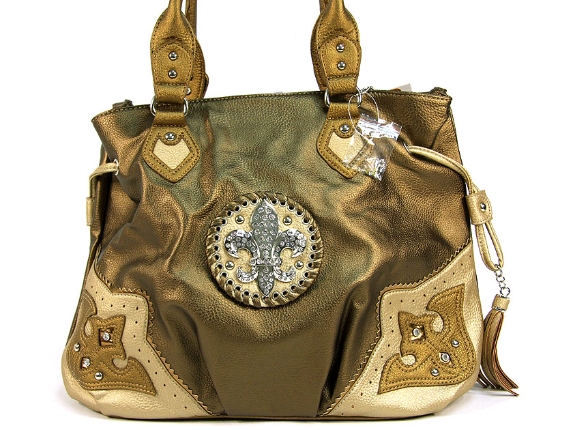 Fleur De Liz Licensed Handbag in Shining PVC. Bag has patchwork design in the corners in contrasting color. Double handle & hanging fringes on the sides of the bag. Top zipper closure. Fleur De Liz logo in center with rhinestones on it.