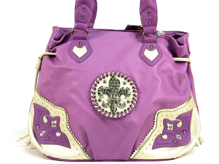 Fleur De Liz Licensed Handbag in Shining PVC. Bag has patchwork design in the corners in contrasting color. Double handle & hanging fringes on the sides of the bag. Top zipper closure. Fleur De Liz logo in center with rhinestones on it.