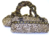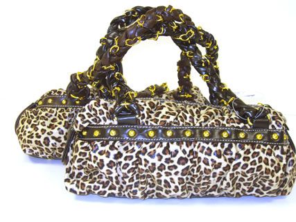 Round Shoulder Bag with animal print pattern has a double handle, top zipper closure and studded details. Made of PU (polyurethane)